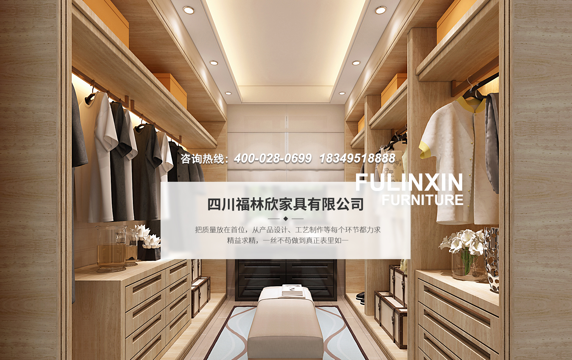 四川福林欣家具有限公司是一家專(zhuān)業(yè)生產(chǎn)整體衣柜、衣帽間、酒柜、鞋柜、電視墻、實(shí)木隔斷、免漆格柵、歐式美式墻板,免漆金屬條木飾面等多種系列的高端定制家具廠。